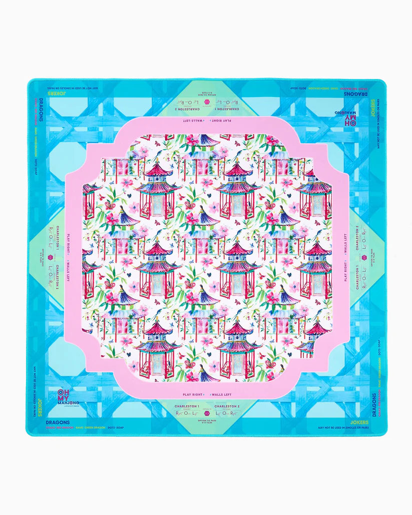 Introducing the Lorelei Mat, a vibrant, artfully chic addition to your Mahjong setup, designed for those with a love for playful elegance and globally inspired design. Drenched in fresh tones of sky blue, punchy pinks, and classic greens, this mat brings together a stunning geometric pattern accented by charming pagodas.