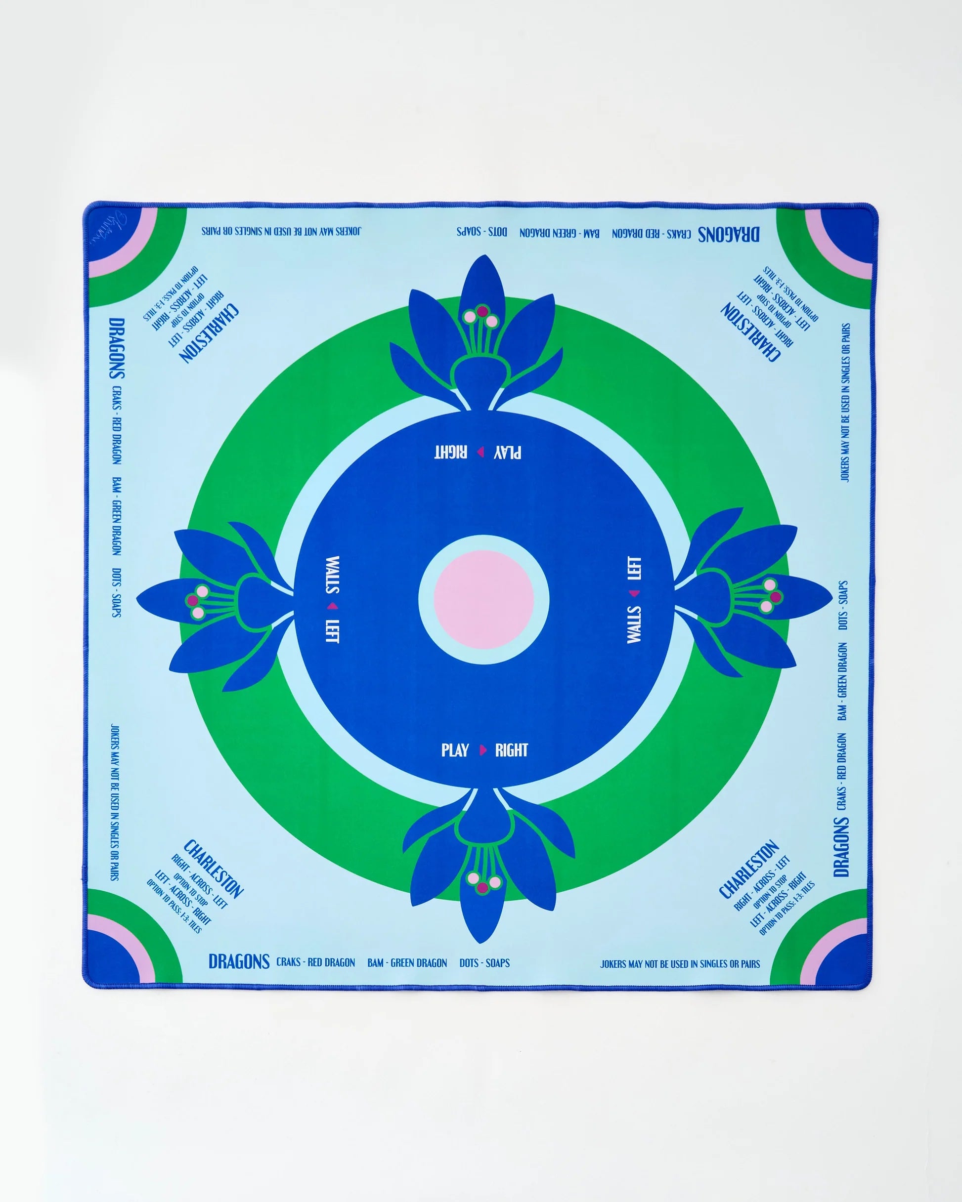 The perfect addition to your game night shenanigans! Not only does this mat scream style with its preppy color scheme, but it's also super functional. Featuring a non-slip surface, it ensures your tiles stay put as you play like a seasoned pro. Plus, it includes essential rules for American Mahjong, covering everything from directions of The Charleston, suit and dragon pairings, gameplay and wall direction and the pesky no jokers in a pair rule.